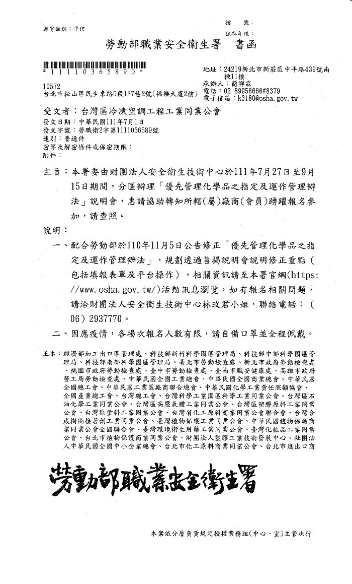 勞動部職業安全衛生署 -於111年7月27日至9月15日分區辦理「優先管理化學品之指定及運作管理辧法」說明會