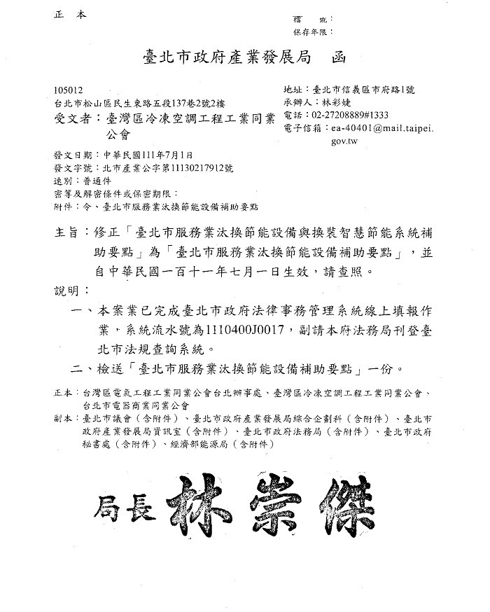 臺北市政府產業發展局-修正「臺北市服務業汰換節能設備補助要點」,於111年7月1日生效,請參閱