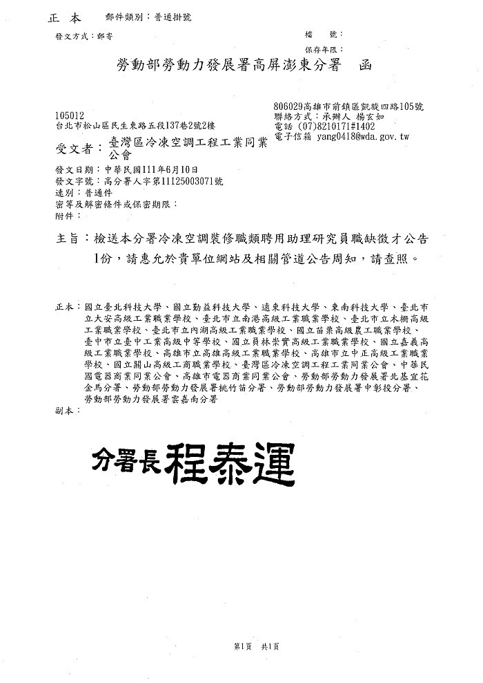 勞動部勞動力發展署高屏澎東分署【冷凍空調裝修職類聘用助理研究員】職缺徵才 公告