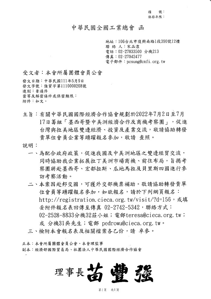 中華民國全國工業總會-2022年7月2日~7月17日籌組「墨西哥暨中美洲經濟合作及商機考察團」,請參閱