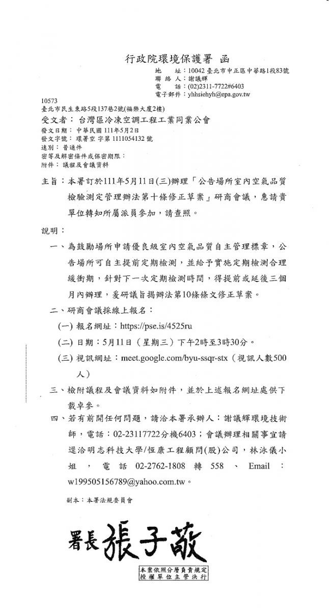 行政院環境保護署-於111年5月11日(三)下午2:30-視訊會議「公告場所室內空氣品質檢驗測定管理辦法第十條修正草案」採線上報名,請參閱