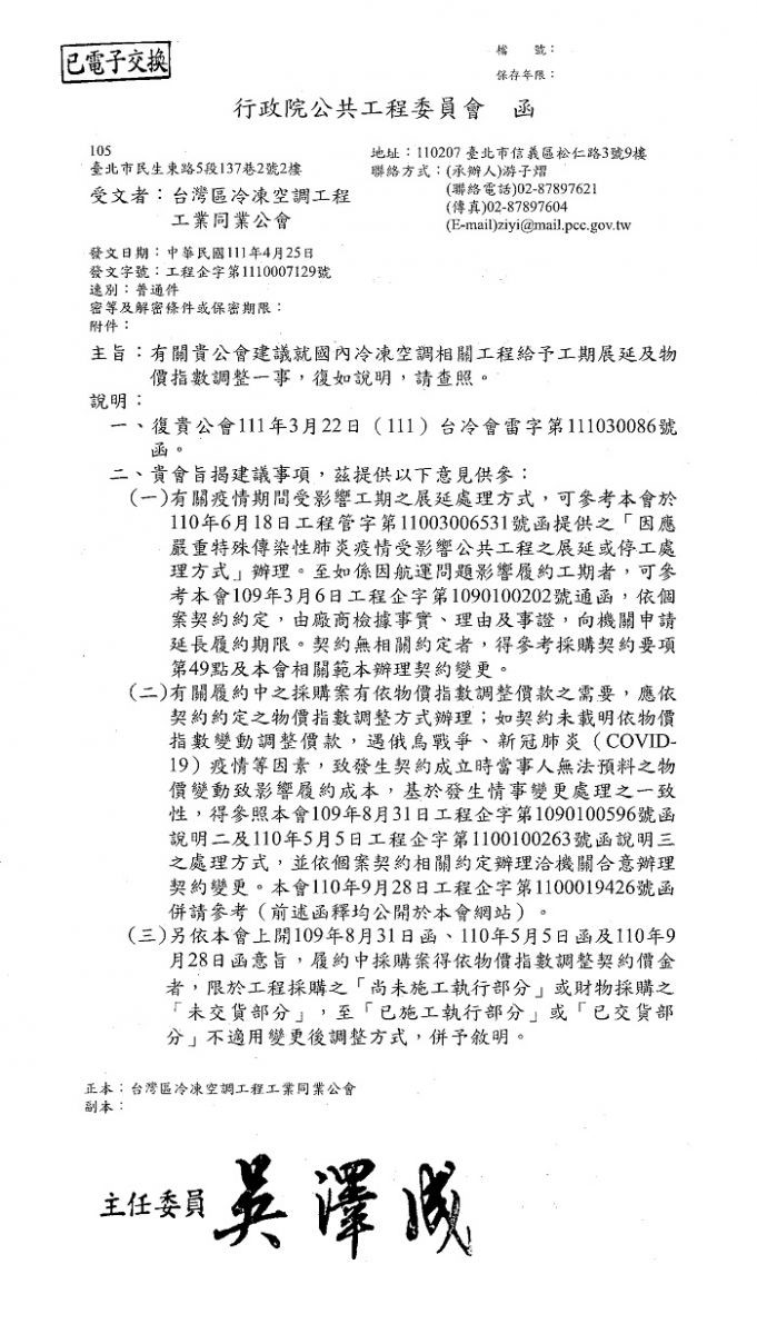 行政院公共工程委員會-「就國內冷凍空調相關工程給予工期展延及物價指數調整」,請參閱