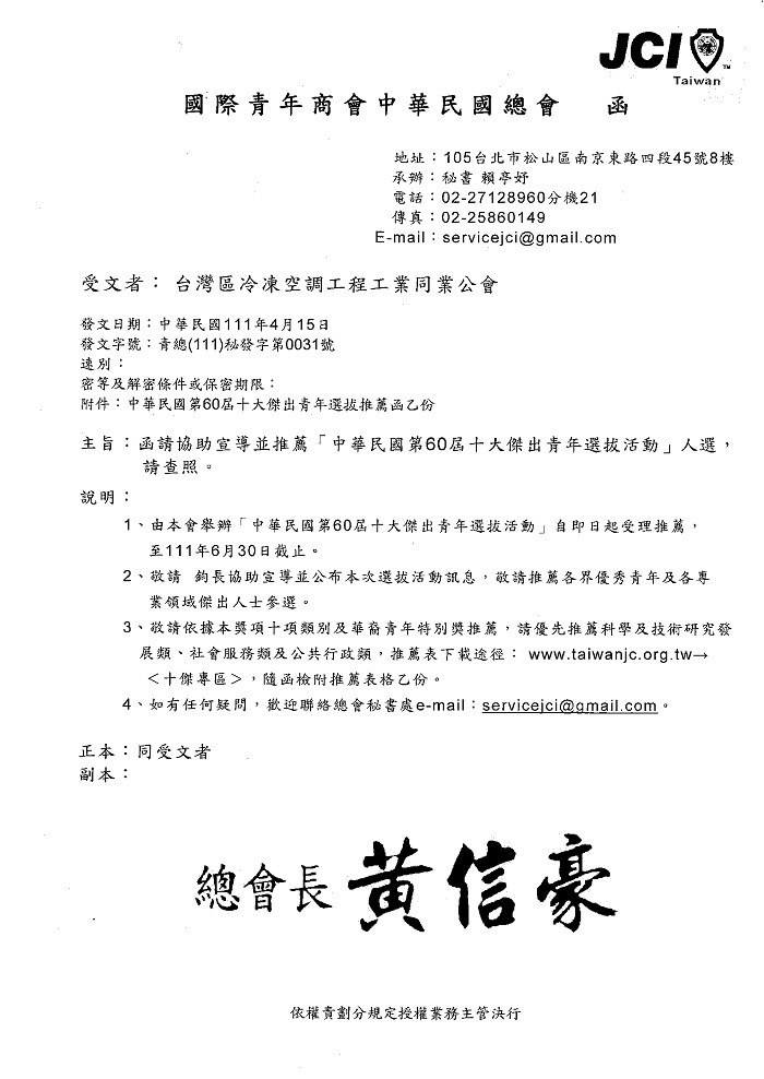 國際青年商會中華民國總會-「中華民國第60屆十大傑出青年選拔活動」人選,請參閱