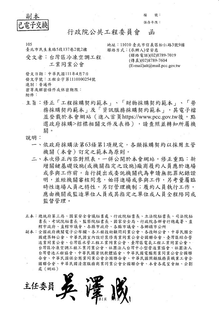 行政院公共工程委員會-修正「工程採購契約範本」、「財物採購契約範本」、「勞務採購契約範本」及「資訊服務採購契約範本」,請參閱