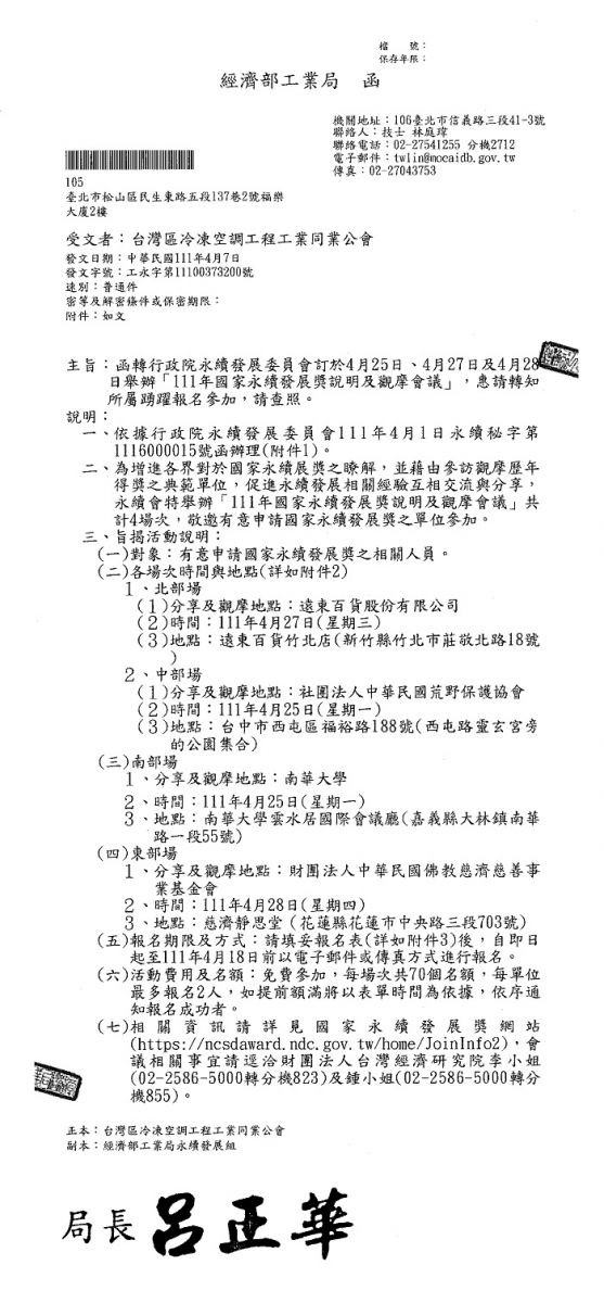 行政院永續發展委員會-於4月25日、4月27日、4月28日舉辧「111年年國家永續發展獎說明及觀摩會議」,請參閱