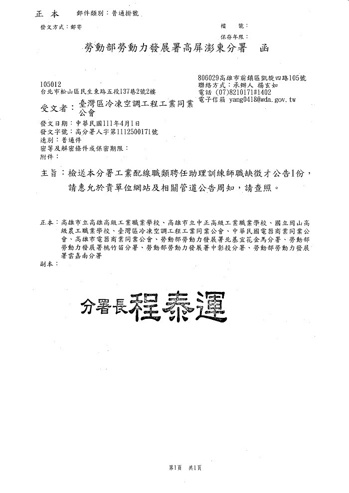 各位業界朋友、會員 請注意!--- 原『經濟部工業局』已升格為『經濟部產業發展署』,若您需要申請冷凍空調業許可、重新許可或其他變更事項時,採用郵寄辦理者,應檢附書件,依序裝訂掛號郵寄至(54003南投市中興新村省府路4號)經濟部產業發展署收,繳費請用郵政匯票,抬頭:經濟部產業發展署。