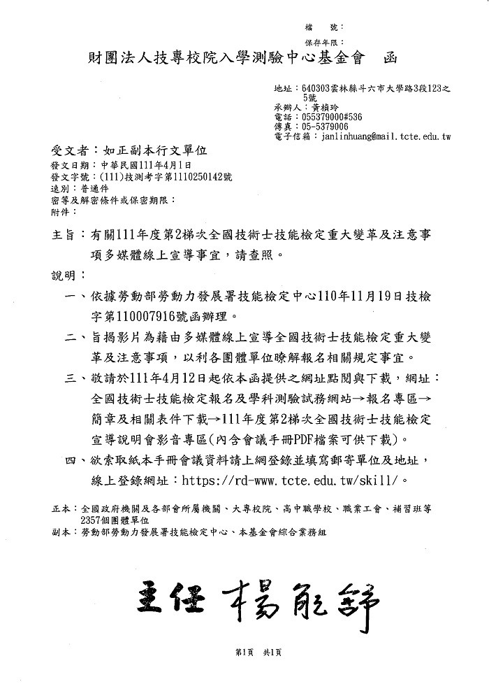 財團法人技專校院入學測驗中心基金會-「111年度第2梯次全國技術士技能檢定重大變革及注意事項多媒體線上宣導事宜」,請參閱