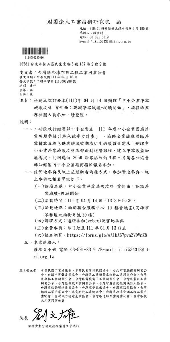 財團法人工業技術研究院-111年4月14日辧理「中小企業淨零減碳攻略 首部曲:認識淨零減碳-從頭開始」,請參閱