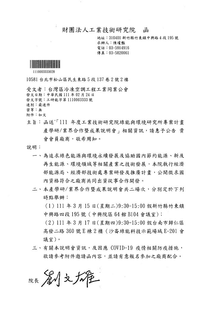 財團法人工業技術研究院-「111年度工業技術研究院綠能與環境研究所專案計畫產學研/業界合作暨成果說明會」,請參閱