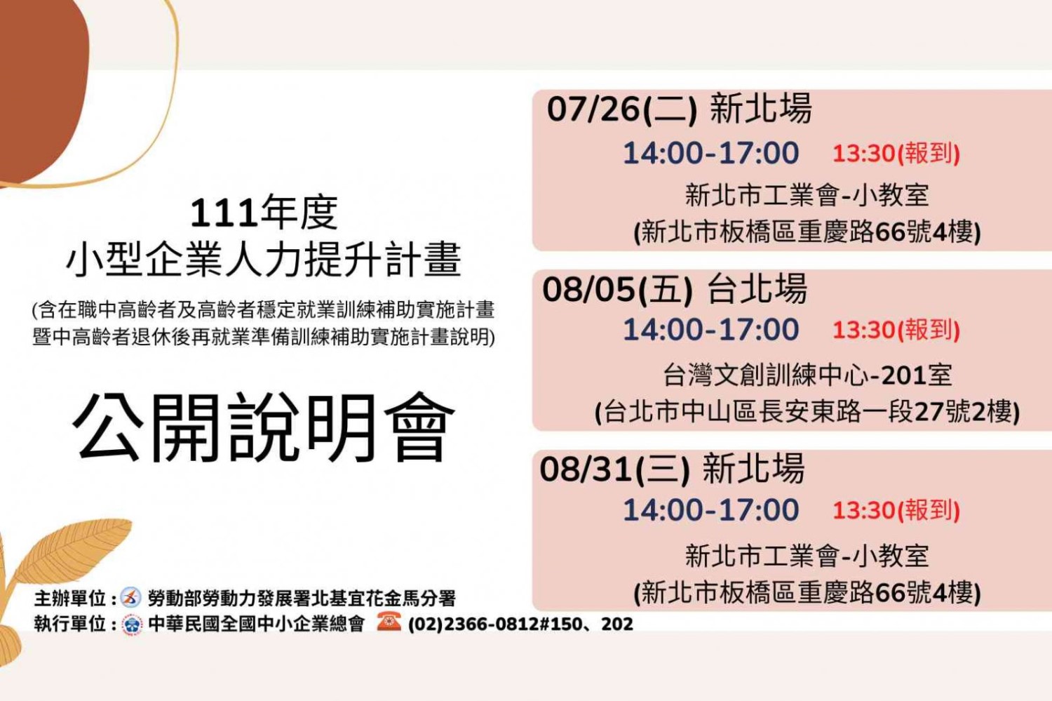 111年度小型企業人力提升計畫受理至111/10/31止,公開說明會將於7-8月辦理公開說明會,邀請有意申請計畫的您(就業保險人數未滿51人)參與說明會,加速瞭解計畫規範。 (含在職中高齡者及高齡者穩定就業訓練補助實施計畫暨中高齡者退休後再就業準備訓練補助實施計畫說明,有意者請踴躍報名!) 說明會場次(13:30開始報到) 一、新北場 時間:7/26(二)14:00-17:00 地點:新北市工業會小教室(新北市板橋區重慶路66號4樓) 二、台北場 時間:8/5(五)14:00-17:00 地點: 台灣文創訓練中心201室(台北市中山區長安東路一段27號2樓) 三、新北場 時間:8/31(三)14:00-17:00 地點:新北市工業會-小教室(新北市板橋區重慶路66號4樓) 報名網址(pencil):https://nasme.ibooking.com.tw/activitys/items?id=163 洽詢電話(telephone):02-2366-0812 #150、#202 ※歡迎各事業單位踴躍報名參加! ※本活動完全免費,請儘早報名,以免向隅。