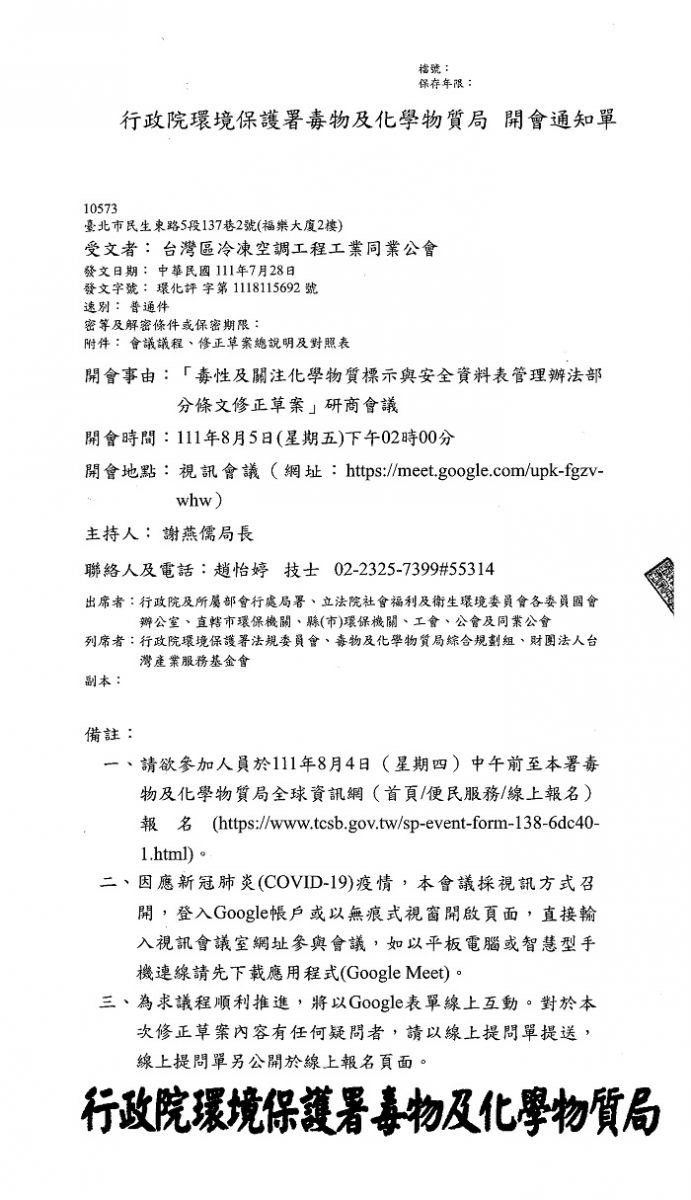 行政院環境保護署毒物及化學物質局-「毒性及關注化學物質標示與安全資料表管理辦法部分條文修正草案」於111年8月5日(星期五)下午2點-視訊會議