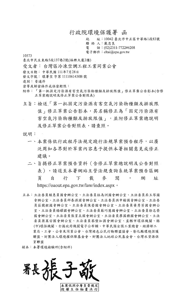 行政院環境保護署-「第一批固定污染源有害空氣污染物種類及排放限值」修正為「固定污染源有害空氣污染物種類及排放限值」,修正草案總說明及修正草案公告對照表,請參閱