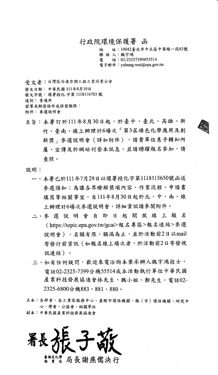 行政院環境保護署-「第3屆綠色化學應用及創新獎」於111年8月30日起臺中、臺北、高雄、新竹、臺南,共6場參選說明會,請踴躍報名參加