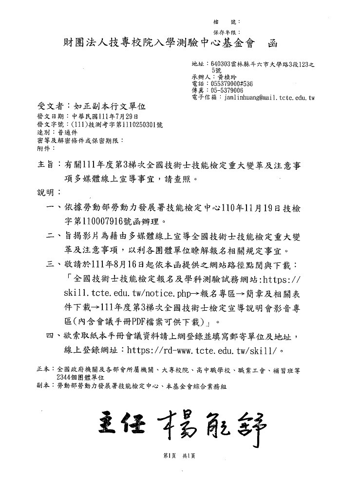 財團法人技專校院入學測驗中心基金會-111年度第3梯次全國技術士技能檢定重大變革及注意事項多媒體線上宣導事宜,於8月16日開放下載
