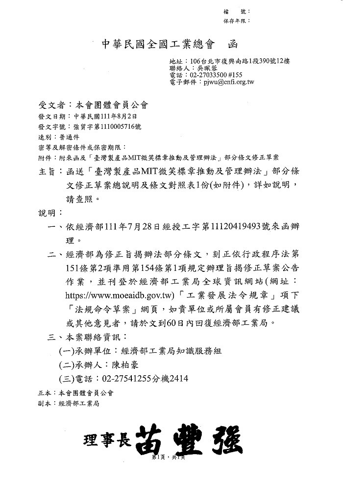 經濟部工業局 - 「臺灣製產品MIT微笑標章推動及管理辦法」部分條文修正草案總說明,請參閱