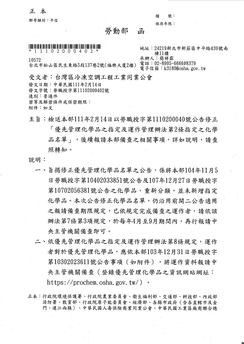 勞動部 -於111年2月14日修正「優先管理化學品之指定及運作管理辦法第2條指定之化學品名單」,請參閱