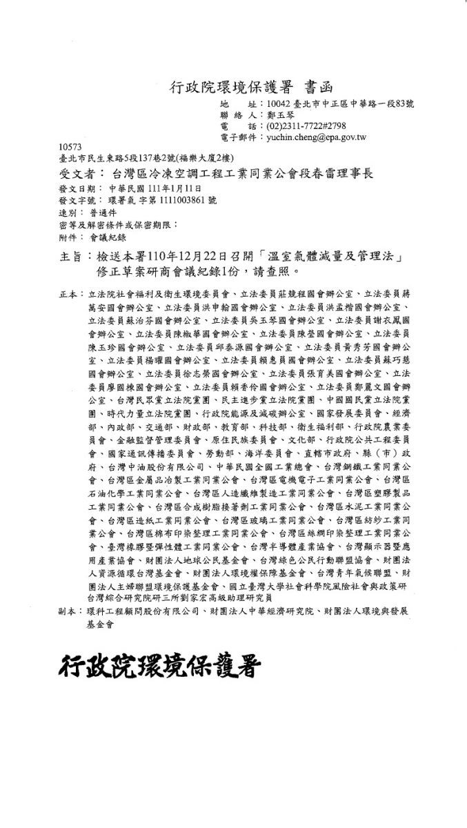行政院環境保護署-於110年12月22日召開「溫室氣體減量及管理法」修正草案會議紀錄,請參閱