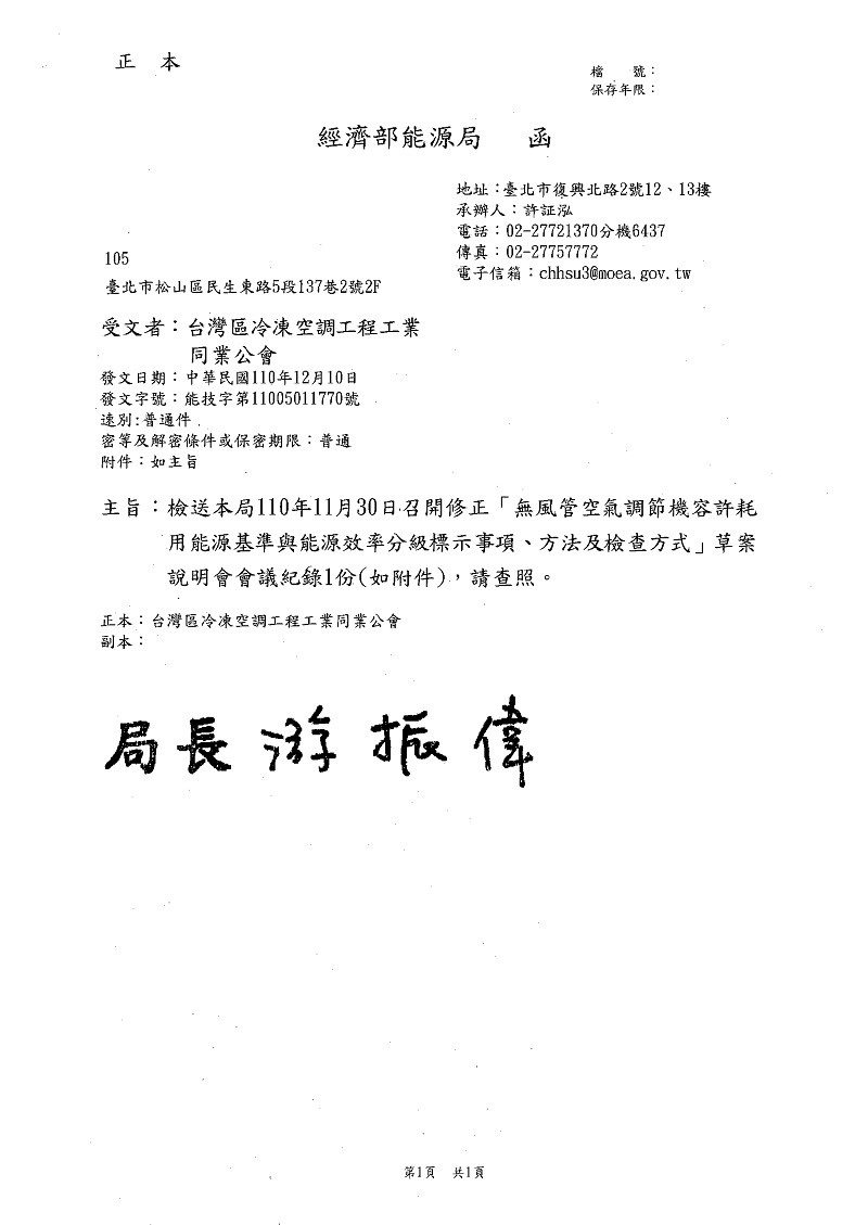 經濟部能源局-於110年11月30日 召開「無風管空氣調節機容許耗用能源基準與能源效率分級標示事項、方法及檢查方式」草案說明會,會議紀錄,請參閱