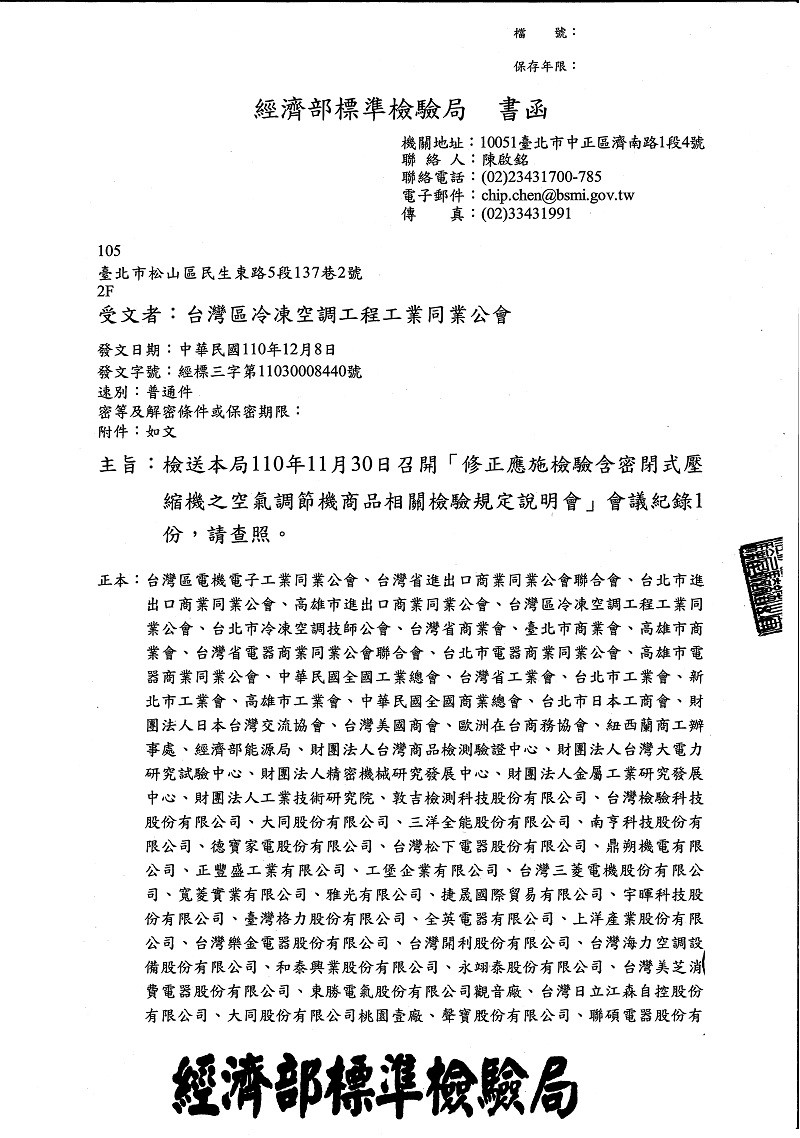 經濟部標準檢驗局 - 於110年11月30日 召開「修正應施檢驗含密閉式壓縮機之空氣調節機商品相關檢驗規定說明會」,會議紀錄,請參閱
