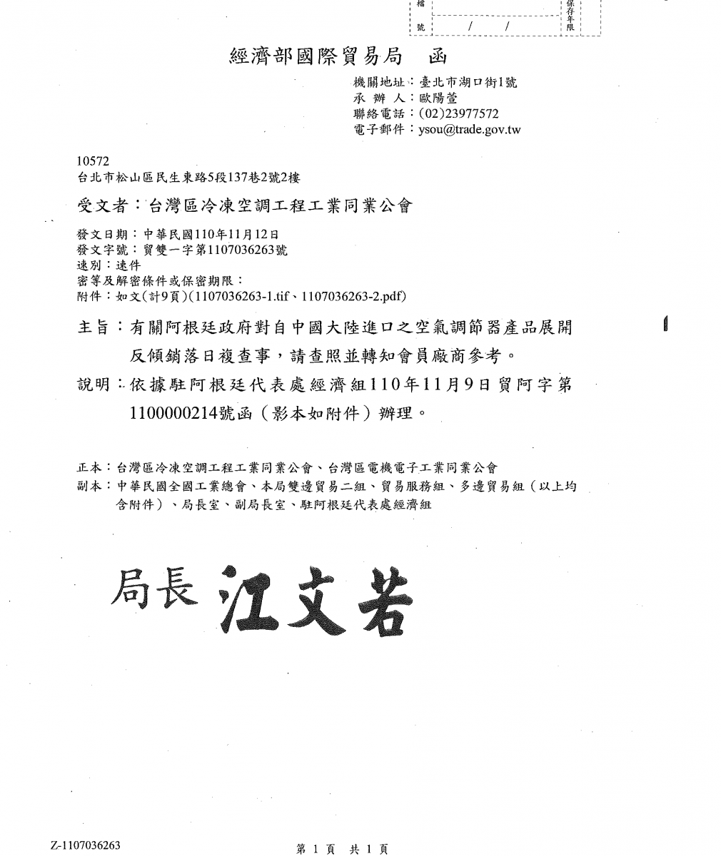 經濟部國際貿易局-「阿根廷政府對自中國大陸進口之空氣調節器產品展開反傾銷落日複查事」,請參閱