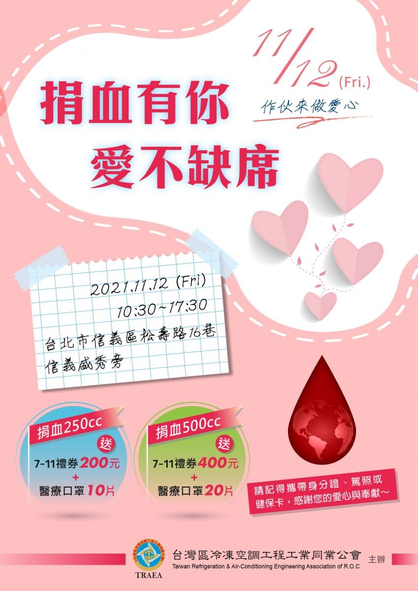 【捐血有你愛不缺席】 於110年11月12日(五)上午10:30~下午17:30止 活動地點:台北市信義區松壽路16巷【信義威秀旁】 歡迎大家踴躍參與,作伙來做愛心