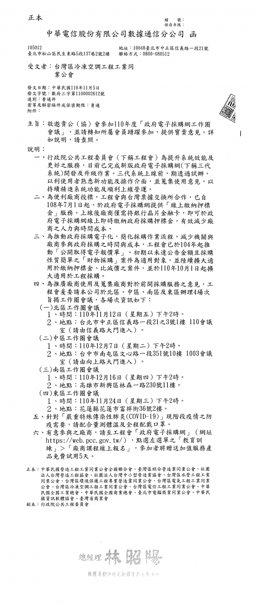 中華電信股份有限公司數據通信分公司-110年度「政府電子採購網工作圈會議」,請踴躍參加,請參閱
