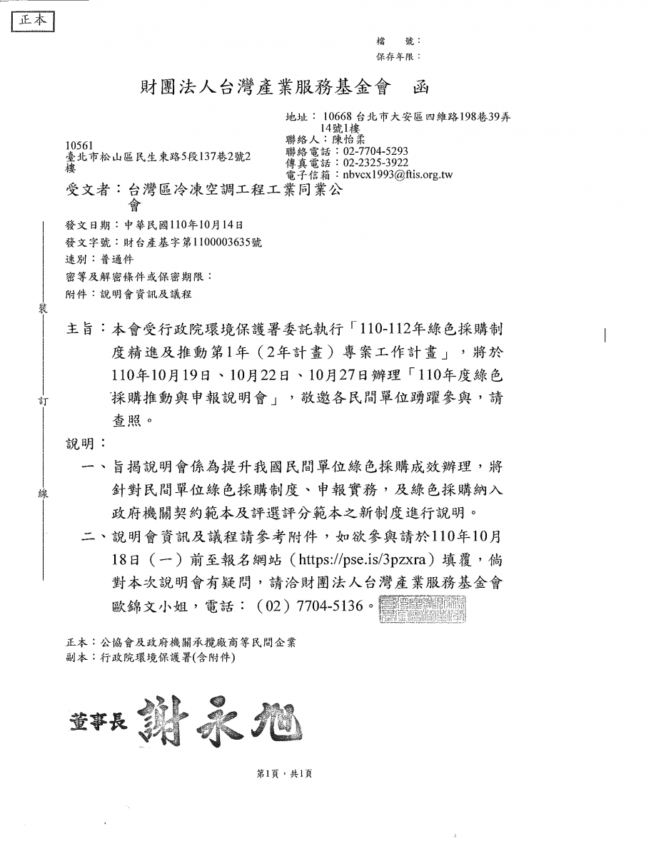 財團法人台灣產業服務基金會-110年10月19、10月22日。10月27日辦理「110年度綠色採購推動與申報說明會」,請參閱