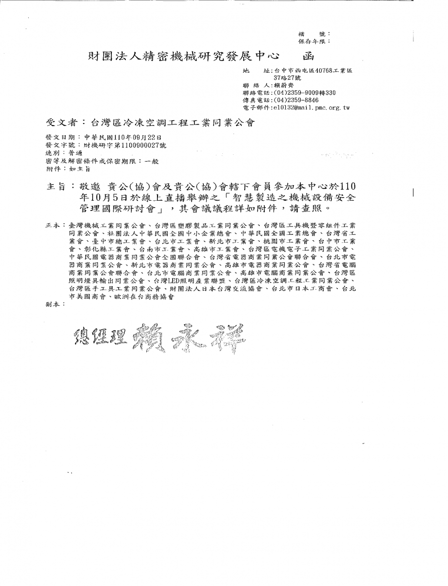 財團法人精密機械研究發展中心-110年10月5日「智慧製造之機械設備安全管理國際研討會」線上直播,請參閱