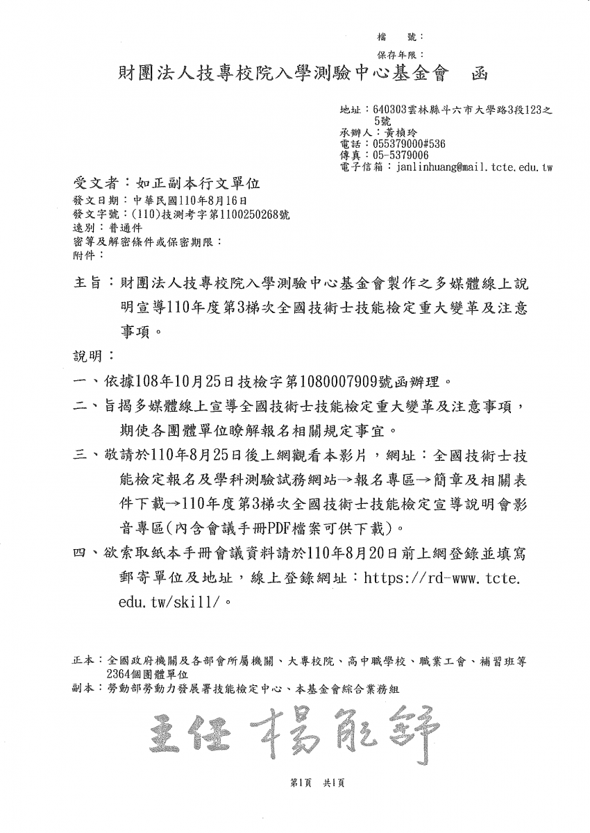 財團法人専校院入學測驗中心基金會-製作多媒體線上說明宣導 【110年度第3梯次全國技術士技能檢定重大變革及注意事項】 請於110年8月25日後上網觀看影片