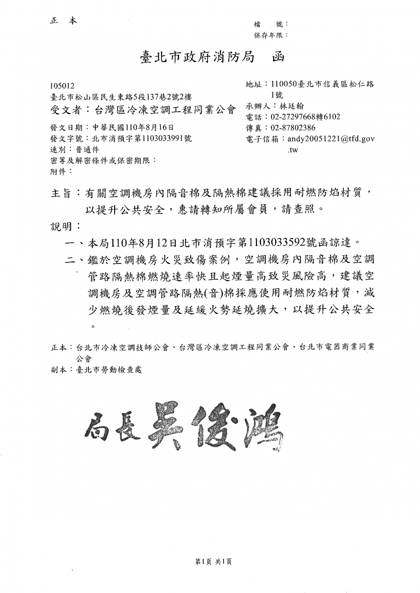 臺北市政府消防局 「空調機房內隔音棉及隔熱棉建議採用耐燃防焰材質,以提升公共安全」,請參閱