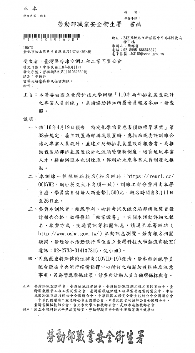 勞動部職業安全衛生署-「110年局部排氣裝置設計之專業人員訓練」,請參閱