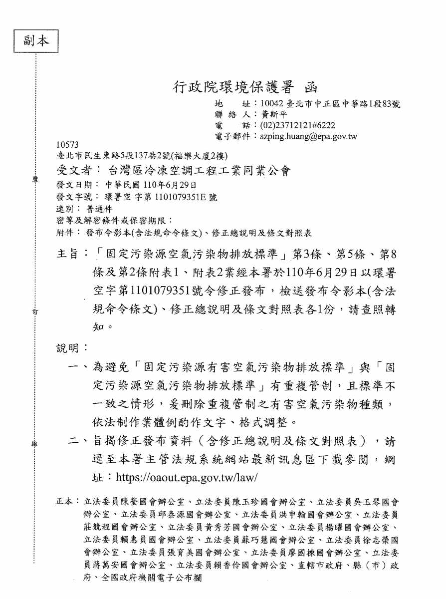 行政院環境保護署「固定污染源空氣污染物排放標準」,第3條、第5條、第8條及第2條附表1、附表2業經本署於110年6月29日以環署空字第1101079351號令修正發布,檢送發布令影本(含法規定令條文)、修正總說明及條文對照表 網站連結:【行政院環境保護署】