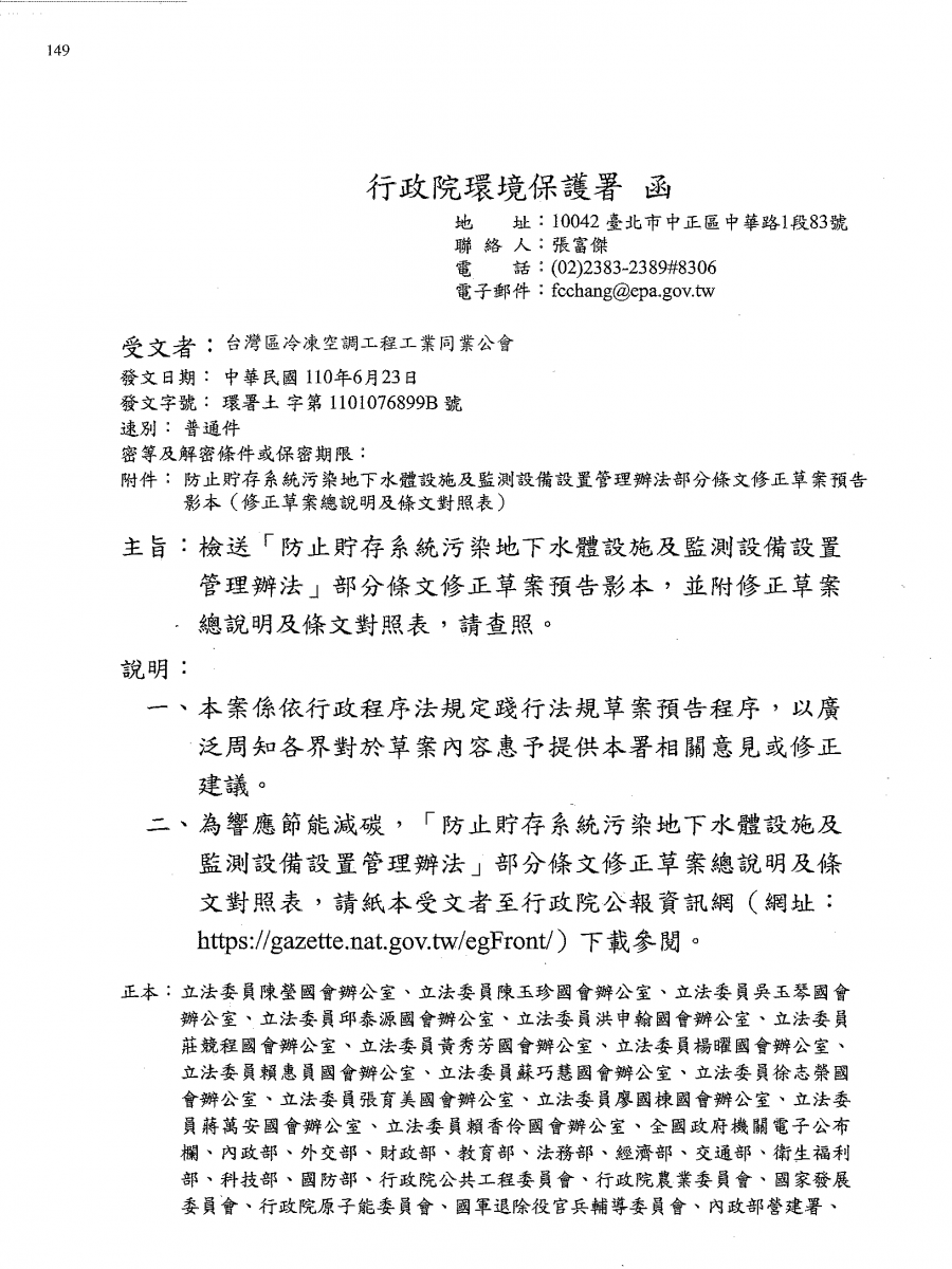 行政院環境保護署「防止貯存系統污染地下水體設施及監測設備設置管理辦法」部分條文修正草案預告,請參閱