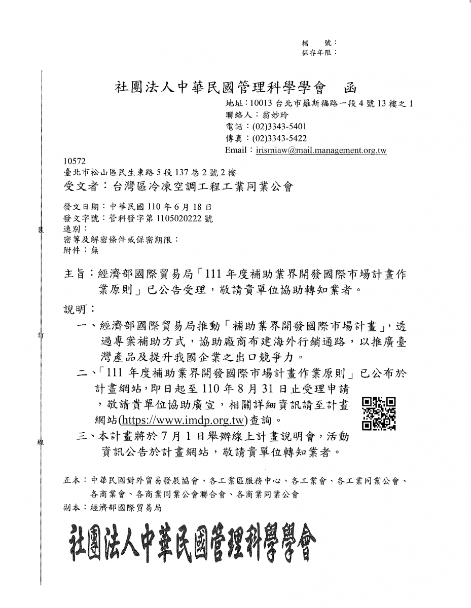 各位業界朋友、會員 請注意!--- 原『經濟部工業局』已升格為『經濟部產業發展署』,若您需要申請冷凍空調業許可、重新許可或其他變更事項時,採用郵寄辦理者,應檢附書件,依序裝訂掛號郵寄至(54003南投市中興新村省府路4號)經濟部產業發展署收,繳費請用郵政匯票,抬頭:經濟部產業發展署。