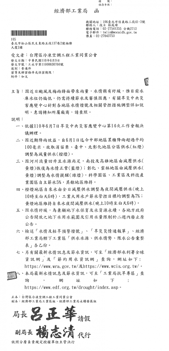 因近日颱風及栂雨鋒面帶來雨量,水情稍有紓緩,目前水庫水位仍偏低,需持續節水因應。