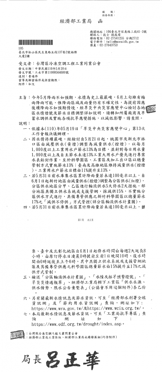 經濟部水利署全球資訊網:https://www.wra.gov.tw/ 節約用水資訊網:https://www.wcis.org.tw/ 工業局抗旱專區:https://www.edf.org.tw/drought/index.asp