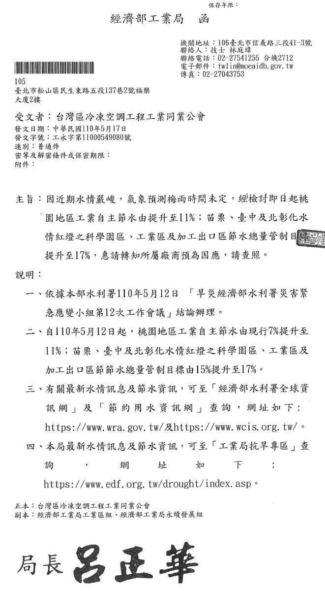 因近期水情嚴峻,即日起桃園地區工業自主節水由提升至11%;苗栗、臺中及北彰化水情紅燈之科學園區、工業區及加工出口區節水總量管制目標提升至17%,惠請會員檢查冷卻水塔是否有漏水