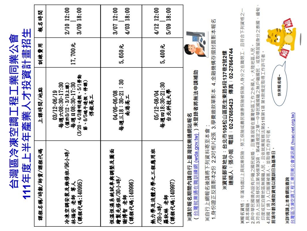台灣區冷凍空調工程工業同業公會—111年度上半年度產業人才投資計畫招生【冷凍空調安裝及維修班、恆溫恆濕系統試車與調整及圖面繪製先修班、熱力學及流體力學之工程應用班】(已開訓)