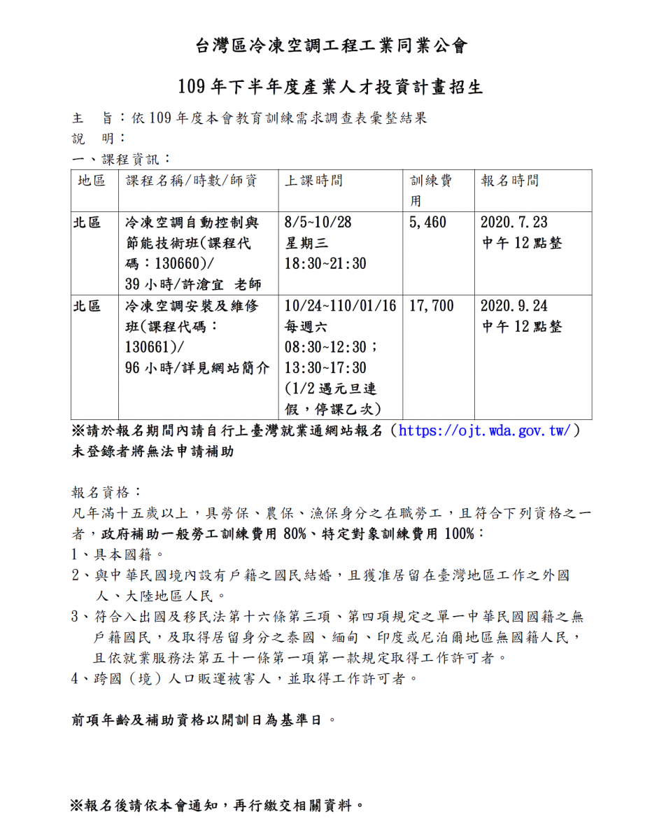 本會109年度下半年產業人才投資計畫—【冷凍空調安裝及維修班】(9/24中午12點整開始報名 )【已開班】