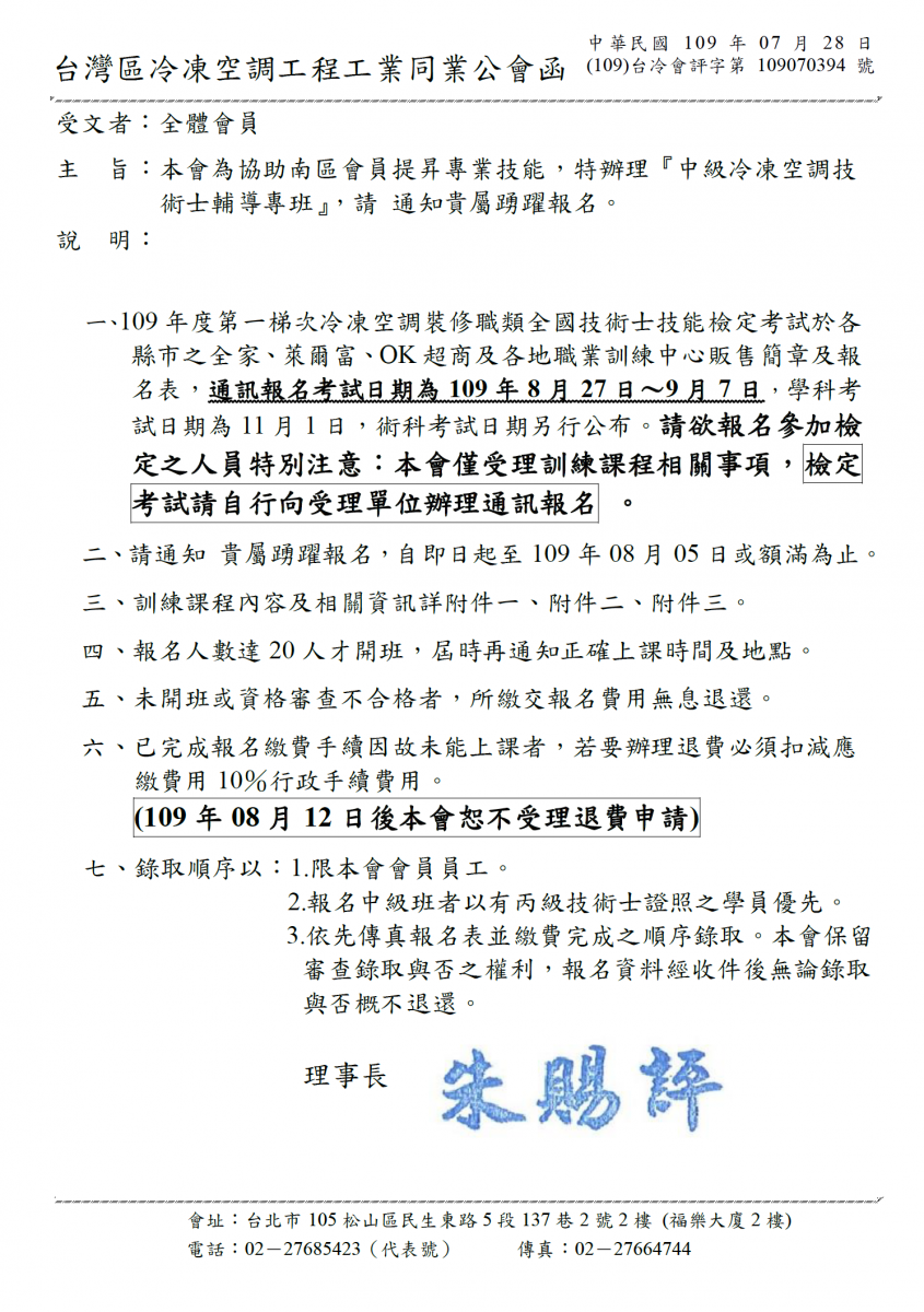 各位業界朋友、會員 請注意!--- 原『經濟部工業局』已升格為『經濟部產業發展署』,若您需要申請冷凍空調業許可、重新許可或其他變更事項時,採用郵寄辦理者,應檢附書件,依序裝訂掛號郵寄至(54003南投市中興新村省府路4號)經濟部產業發展署收,繳費請用郵政匯票,抬頭:經濟部產業發展署。