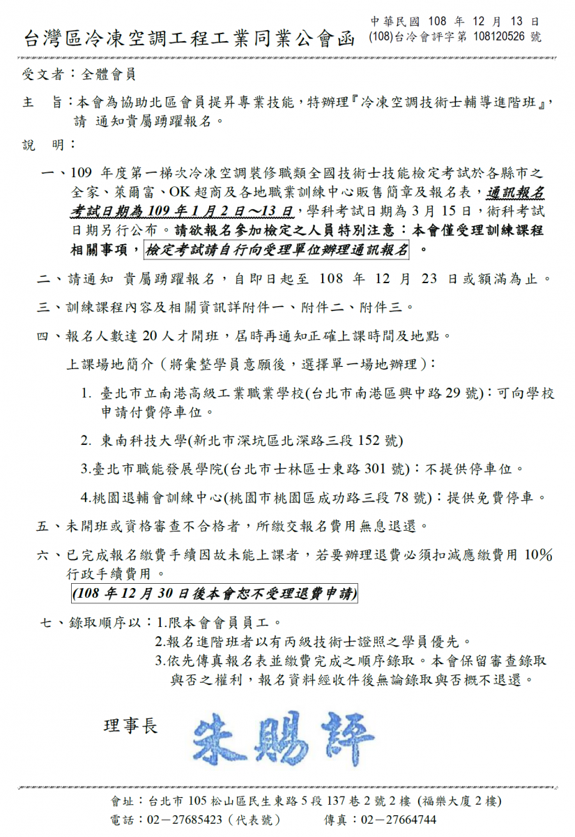 109年度『北區』冷凍空調業第一梯次『冷凍空調技術士輔導進階班』【已開班】