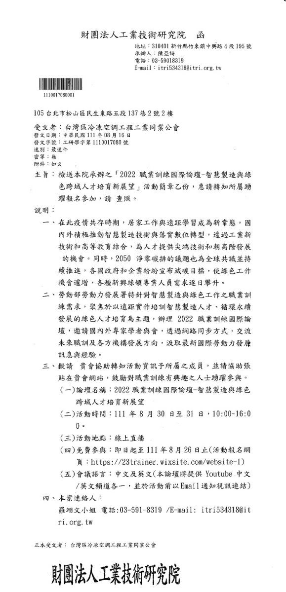 財團法人工業技術研究院-8月30至31日上午 10點~下午16點「2022職業訓練國際論壇-智慧製造與綠色跨域人才培育新展望」線上直播,請踴躍報名