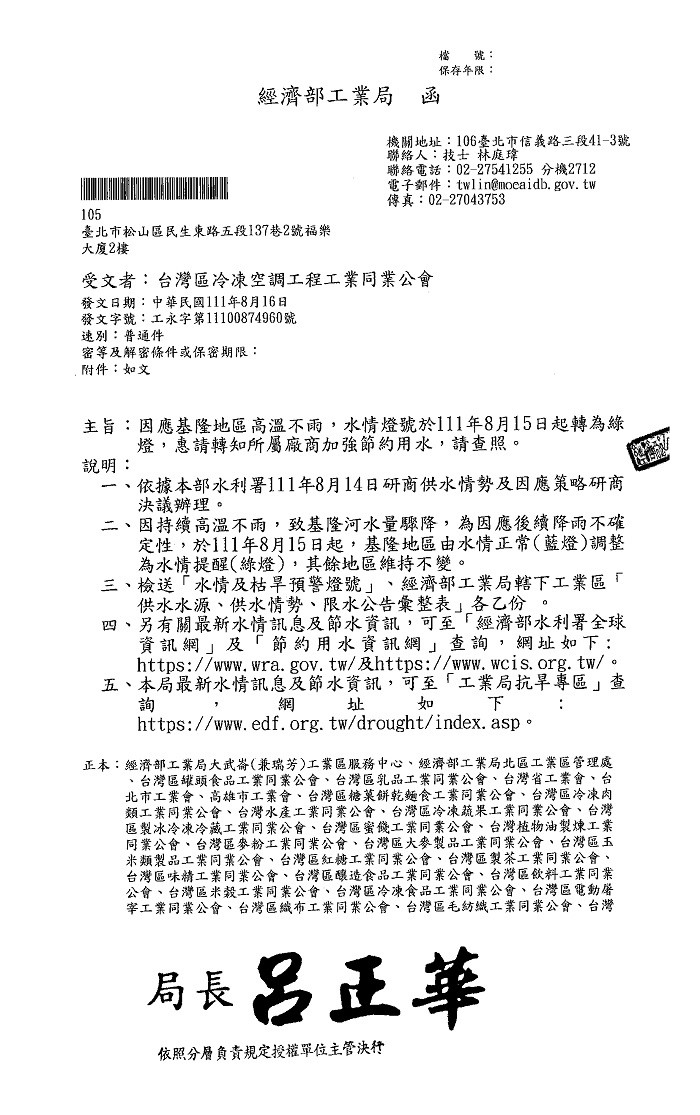 經濟部工業局-因應基隆地區高溫不雨,水情燈號於111年8月15日起轉為綠燈,請節約用水