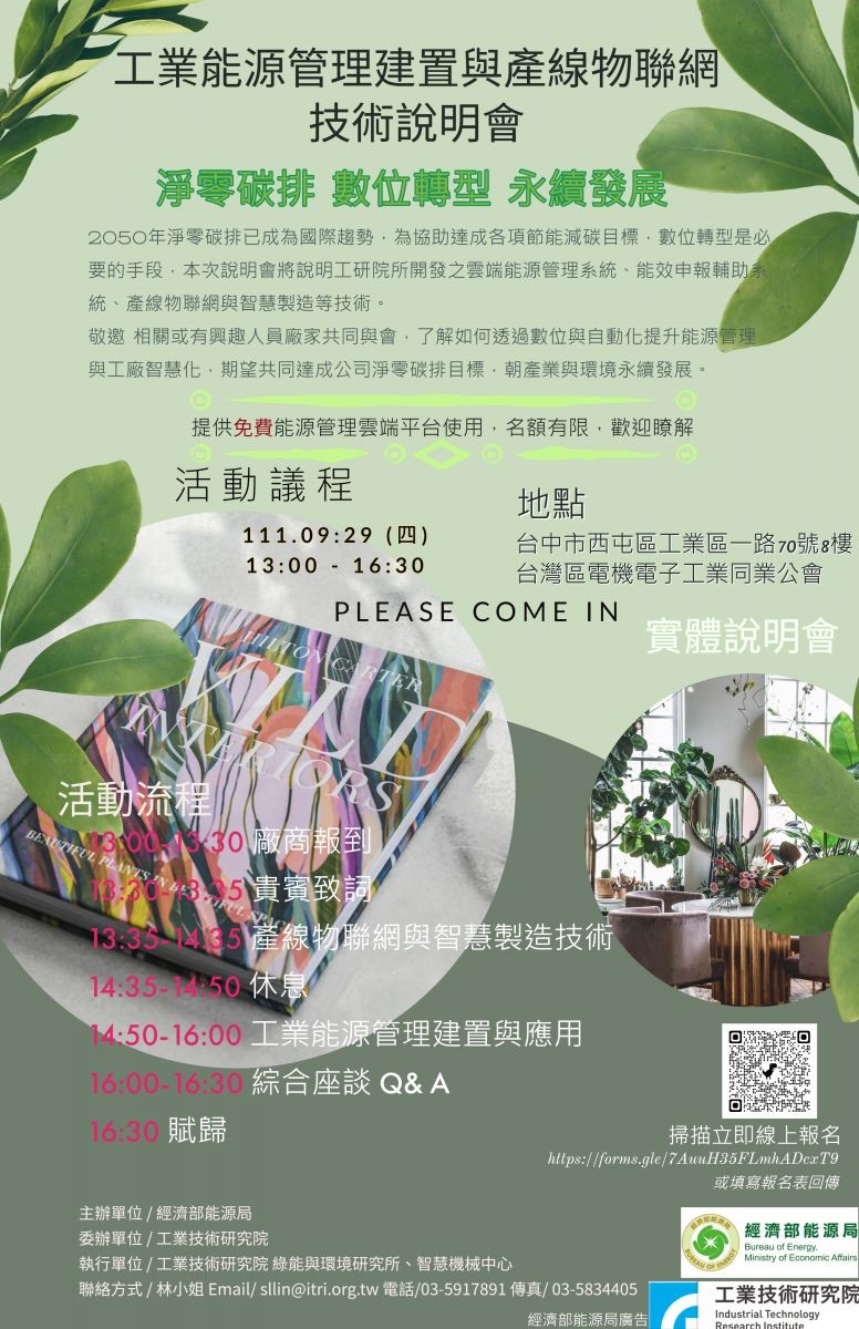 經濟部能源局-111年9月29(四)下午13:00~16:30「工業能源管理建置與產線物聯網技術說明會」,請踴躍報名參加