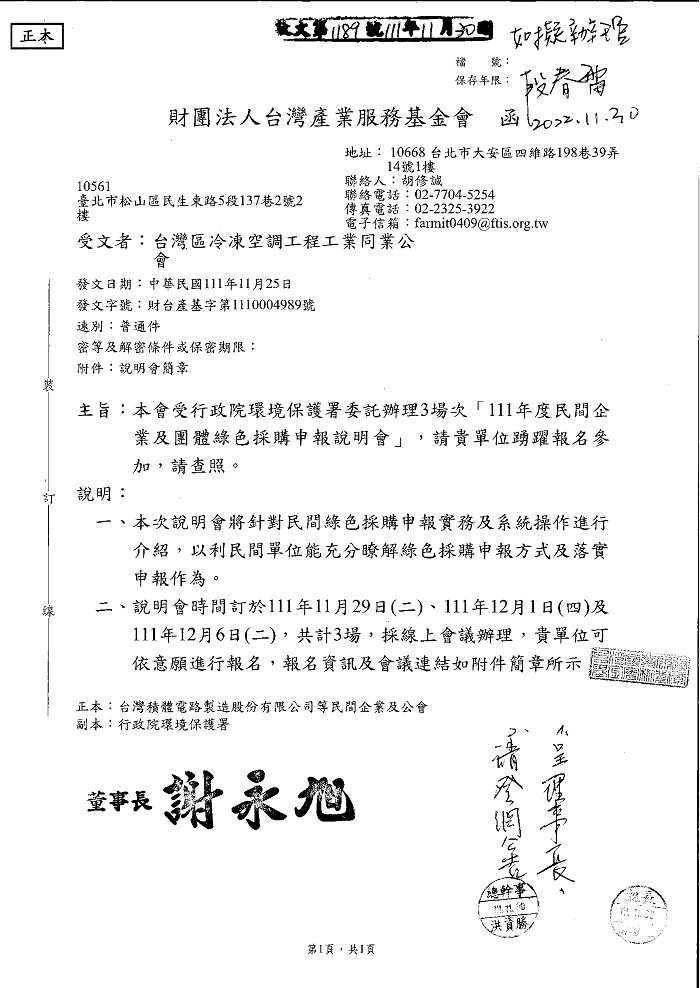 行政院環境保護署-「111年度民間企業及團體綠色採購申報說明會」於111年11月29日(二)、12月1日(四)、12月6日(二),下午13:45~16:00,共計3場,線上會議,請踴躍報參加