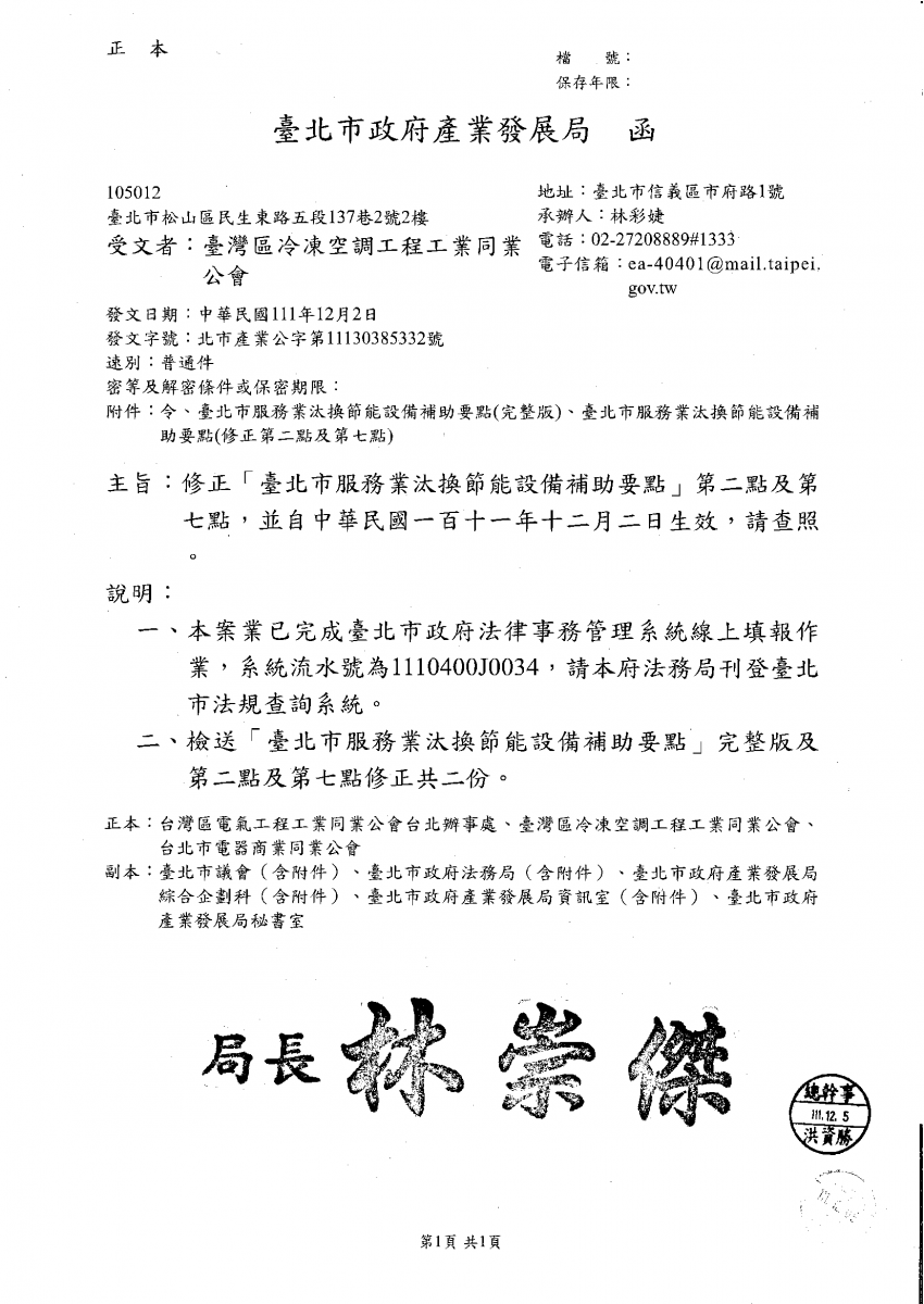 臺北市政府產業發展局-修正「臺北市服務業汰換節能設備補助要點」第二點及第七點,111年12月2日生效,請參閱