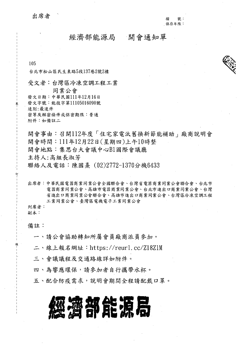 經濟部能源局-111年12月22日(星期四)上午10:00「住宅家電汰舊換新節能補助」廠商說明會,請踴躍報名參加