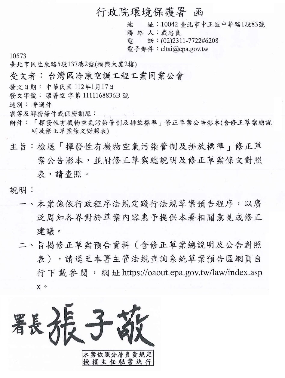 行政院環境保護署旨揭「揮發性有機物空氣污染管制及排放標準」修正草案公告影本及修正草案總說明及修正草案條文對照表,惠予提供相關意見或修正建議!