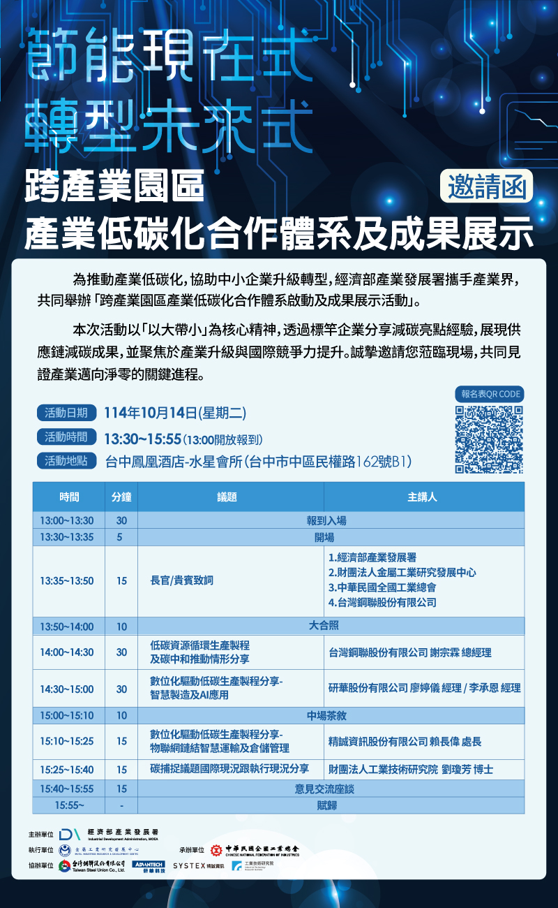 為推動產業低碳化,協助中小企業升級轉型,產發署攜手產業界,共同舉辦「跨產業園區產業低碳化合作體系啟動及成果展示」。 本次成果展以「節能現在式×轉型未來式」為主軸,透過標竿企業分享減碳亮點經驗,展現供應鏈減碳成果,並聚焦於產業升級與國際競爭力提升。 📌歡迎對智慧化減碳、碳捕捉議題有興趣的業界先進踴躍報名參加。 💡114年產業低碳化成果展示💡 邀請函資料: 請點選 報名連結: 請點選